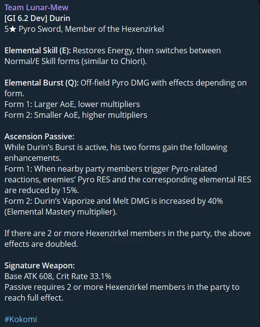Инсайд от Kokomi пролил свет на умения одного из самых ожидаемых героев Genshin Impact – Дурина, чье появление в версии 6.2 подтверждено многими инсайдерами, но не официально.