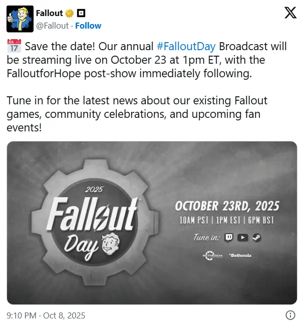 Bethesda официально подтвердила, что ежегодная трансляция Fallout Day 2025 пройдет 23 октября. В этот день фанатам пообещали свежие новости о текущих играх серии, но не стоит ждать громкого анонса Fallout 5. Вместо этого разработчики сосредоточатся на обновлениях и мероприятиях для уже существующих проектов.
