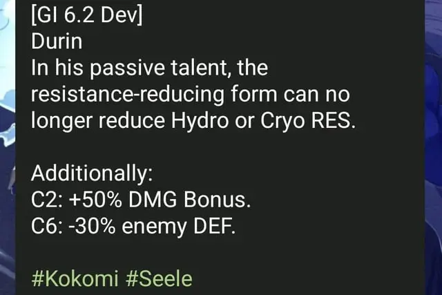 Однако как сообщили Kokomi и Seele, разработчики уже внесли некоторые изменения в его талант. Теперь форма, отвечающая за снижение сопротивлений, больше не уменьшает сопротивление к Гидро и Крио. Видимо, таким образом HoYoverse пытается сбалансировать персонажа. Но до беты 6.2, как и во время нее, все еще может неоднократно измениться.