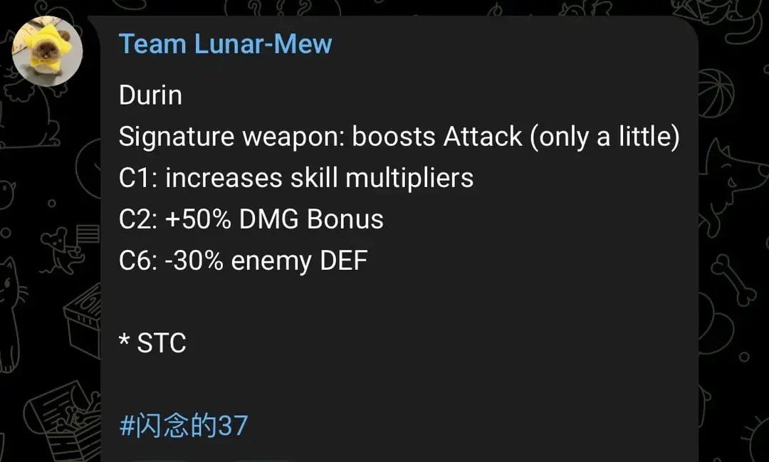 По словам 闪念的37, сигнатурное оружие Дурина лишь слегка повышает показатель атаки, однако его созвездия компенсируют это: