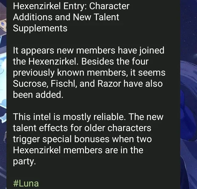 Инсайдер Luna пошла дальше – она заявила, что к фракции относятся и другие герои, помимо слитых ранее. Это Сахароза, Фишль и Рейзор. Информация, по словам источника, «в основном надежная», и выглядит правдоподобно, если вспомнить их связи с алхимией и мистикой. Сахароза – ученица Альбедо, Фишль – самопровозглашенная Принцесса осуждения, Рейзор – воспитанный волками мальчик, чья сила и происхождение до сих пор хранят немало тайн.
