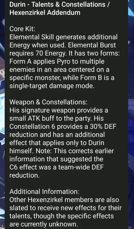 По данным инсайдера Meng, Дурин получит достаточно сложный, но при этом гибкий набор умений. Его Элементальный навык будет генерировать дополнительную энергию при использовании, а Взрыв стихии потребует 70 единиц энергии и будет иметь две формы: