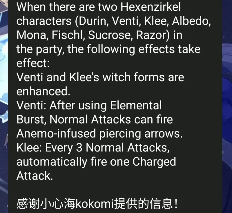 Тем временем инсайдер Kokomi рассказал о новой синергии для персонажей, принадлежащих к фракции Ведьмин Шабаш – это Дурин, Венти, Кли, Альбедо, Мона, Фишль, Сахароза и Рэйзор. Если в команде находится два представителя Шабаша, активируются особые эффекты.
