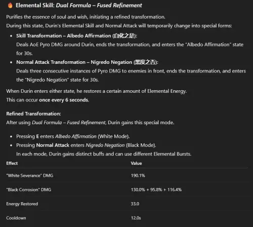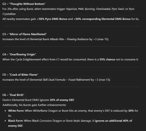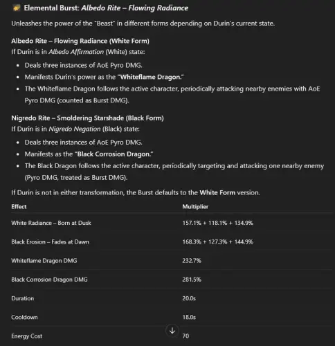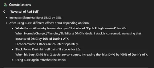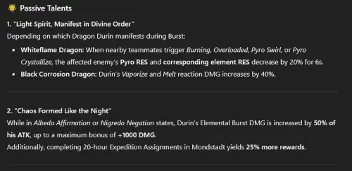 Просто переведите текст в картинке с помощью Google Объектива. Если коротко, то Дурин сможет бить Пиро уроном из кармана с помощью своей ульты, а также наносить повышенный урон усиленными базовыми атаками и Е-шкой.