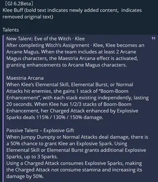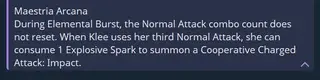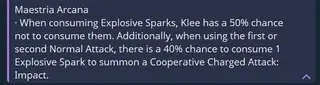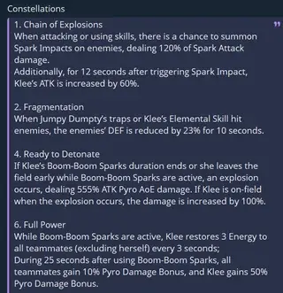 Кли – когда атаки Кли (обычные, заряженные, нвык или ульта) попадают по противнику, она получает 1 уровень эффекта «Бум-усиление» на 20 секунд. С 1/2/3 уровнями Бум-усиления улучшенные заряженные атаки наносят 115% / 130% / 150% от исходного урона.