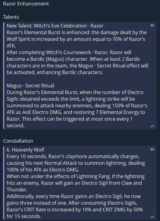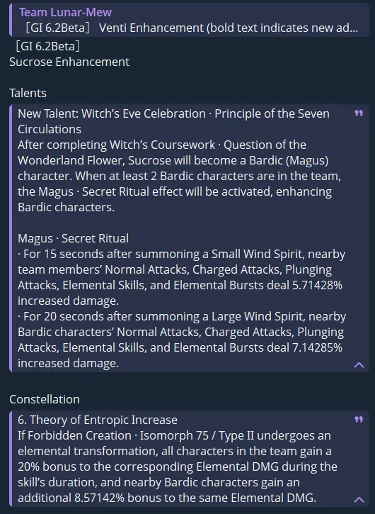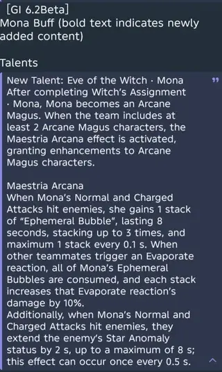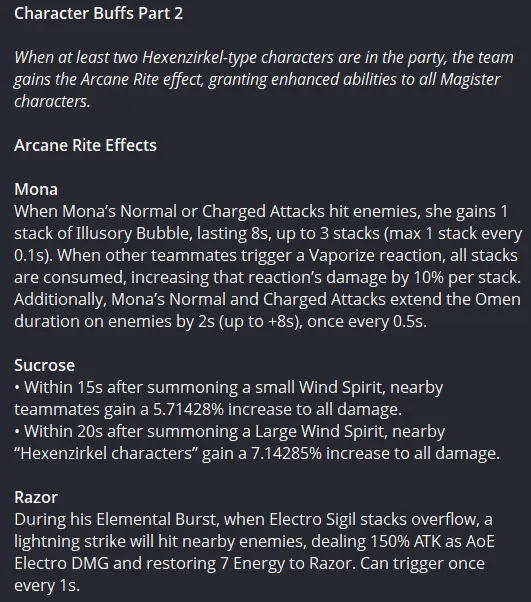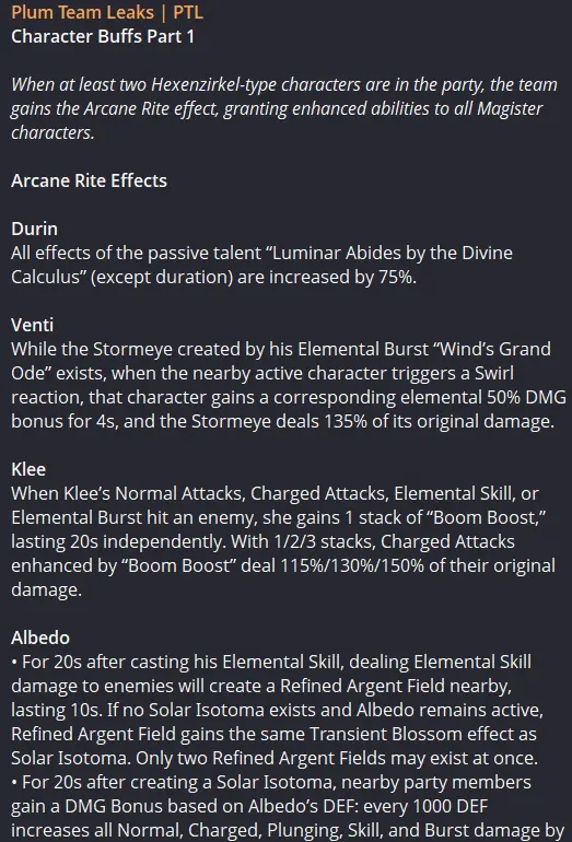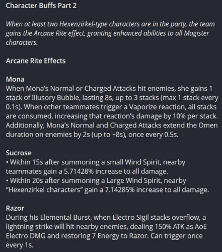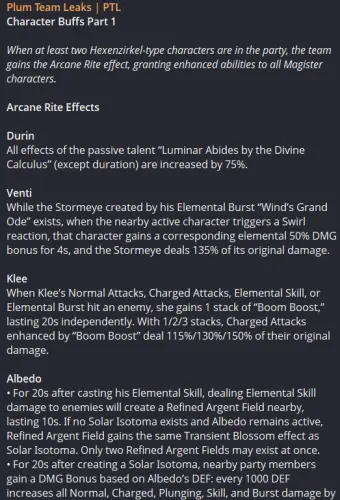 Инсайдеры O1 и Jelena поделились более подробными характеристиками будущих изменений. Если в команде есть два или больше персонажей Шабаша, срабатывает эффект «Арканный ритуал», который значительно повышает их урон и добавляет новые бонусы: