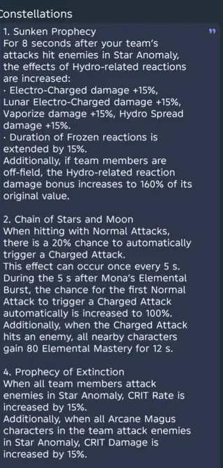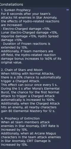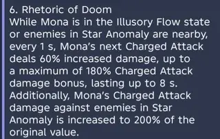 Мона – когда ее обычные или заряженные атаки попадают по врагам, Мона получает 1 стак эффекта Отражение фатума (до 3 уровней, максимум 1 раз каждые 0,1 сек.), действующий 8 секунд. Когда другие члены отряда вызывают реакцию Пар, все стаки расходуются, увеличивая урон реакции на 10% за каждый уровень. Обычные и заряженные атаки Моны также продлевают действие ульты Моны на врагах на 2 секунды, максимум – до 8 сек.