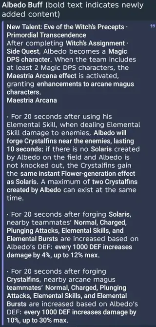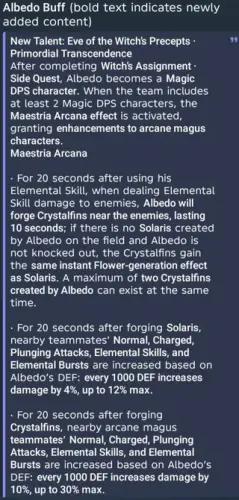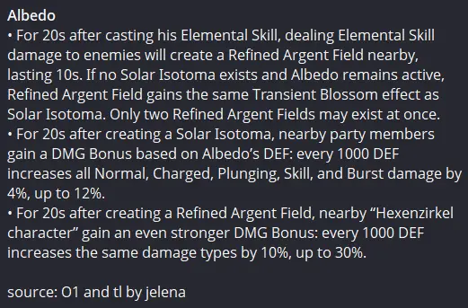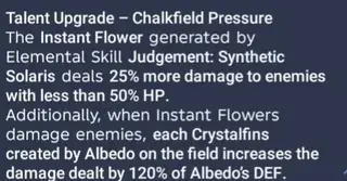В течение 20 секунд после создания Цветка солнца, члены отряда получают бонус урона, зависящий от защиты Альбедо: каждые 1 000 защиты дают +4% урона ко всем видам атак, максимум – +12%. В течение 20 секунд после создания поля, персонажи Шабаша получают бонус: каждые 1 000 защиты дают +10% урона ко всем видам атак, максимум – +30%