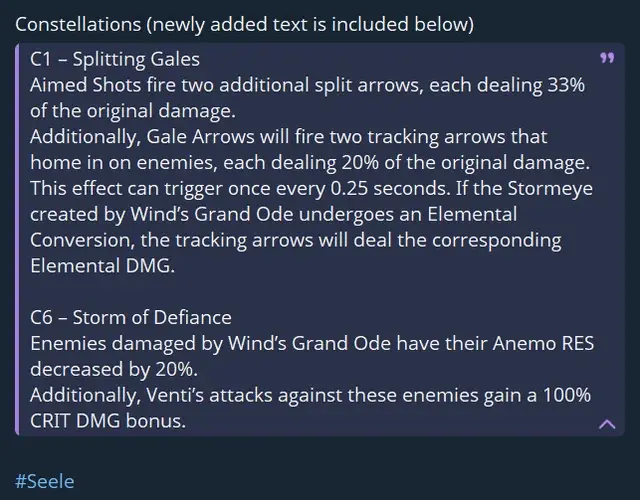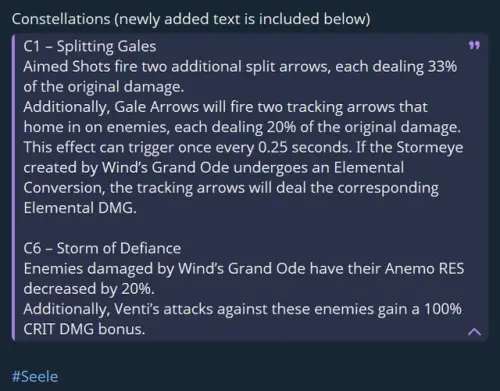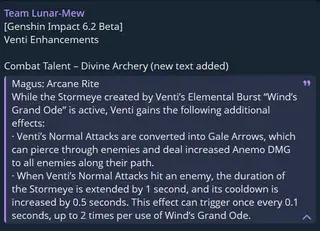 Венти – пока существует Глаз бури, созданный его ультимейтом: если активный персонаж поблизости вызывает реакцию Рассеивание, он получает бонус к урону соответствующим элементом +50% на 4 секунды. Урон Глаза бури увеличивается до 135% от базового значения.
