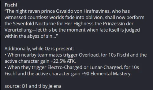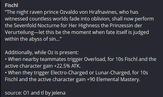 - Когда союзники вызывают Перегрузку, на 10 секунд Фишль и активный персонаж получают +22,5% к силе атаки.