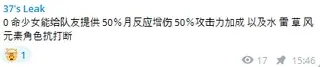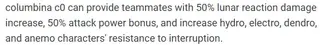Согласно утечке, Коломбина на C0 способна увеличивать урон от лунных реакций на 50%, а также давать всем союзникам бонус к атаке в 50%. Помимо этого, ее присутствие в команде повышает устойчивость к прерыванию у персонажей Гидро, Электро, Дендро и Анемо, что делает ее невероятно полезной в отрядах, где атаки героя могут прервать.