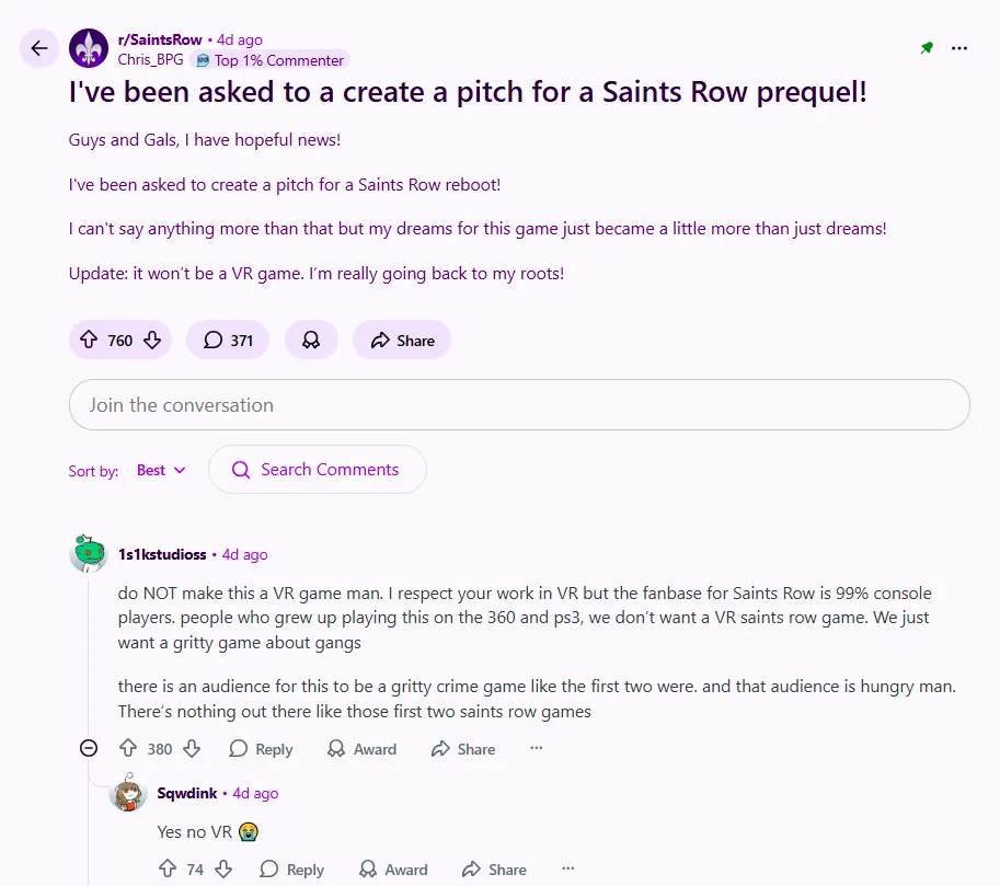 Интересно, что нынешняя студия Стокмана, Bit Planet Games, известная VR-проектами, может работать над этой идеей. Но Крис сразу успокоил фанатов: никакого VR в Saints Row 0 не будет. Все останется в духе классических приключений на привычных платформах.