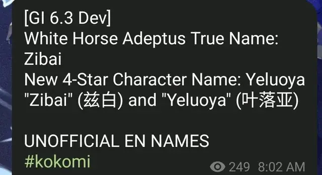 Имя персонажа, согласно информации от kokomi – Цзы Бай (Zibai / 兹白). Конечно, официальная локализация может отличаться от утечки.