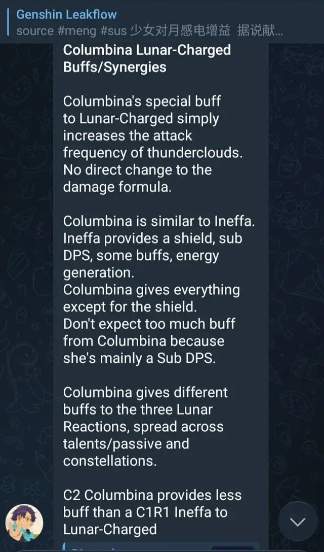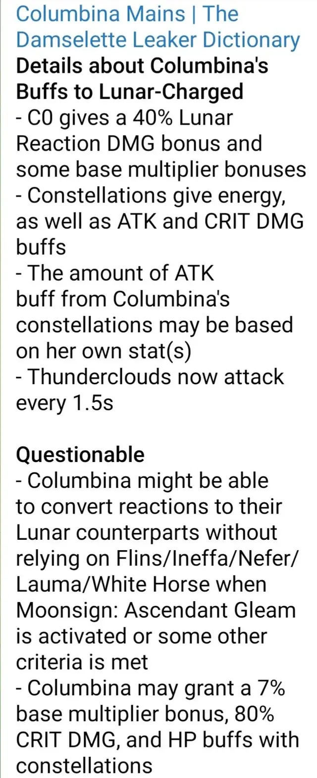 По данным 元素反应, Коломбина на C0 дает 40% бонус урона Лунных реакций, а также дополнительные базовые множители. Созвездия, судя по утечкам, дают энергию, а также баффы к атаке и критическому урону. Причем количество атаки, как предполагают, может масштабироваться от ее собственных характеристик.
