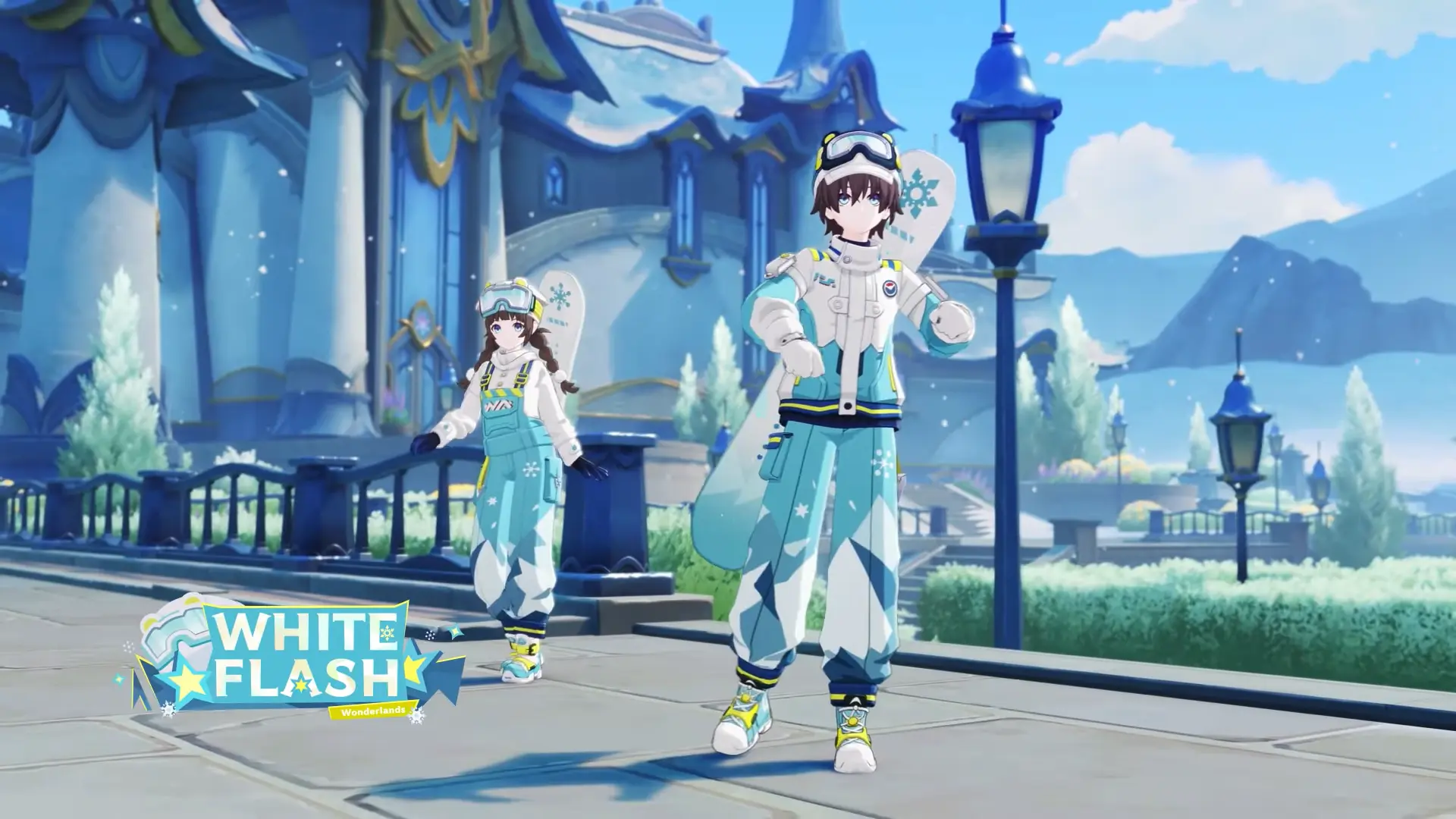 Горнолыжный комплект: один из тематических образов – полноценный зимний аутфит в бело-голубой гамме. Персонаж предстает в лыжной маске, сноубордом и утепленной экипировкой.