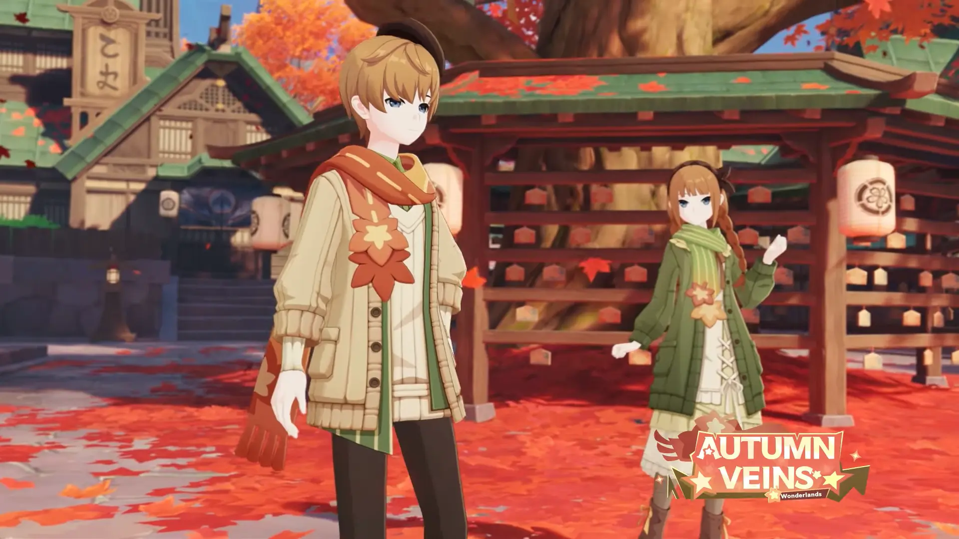Осенний сет в духе Инадзумы: еще один уютный комплект – осенний наряд в красно-бело-зеленой палитре. Он включает вязаные кофты и шарфы с декоративными листьями