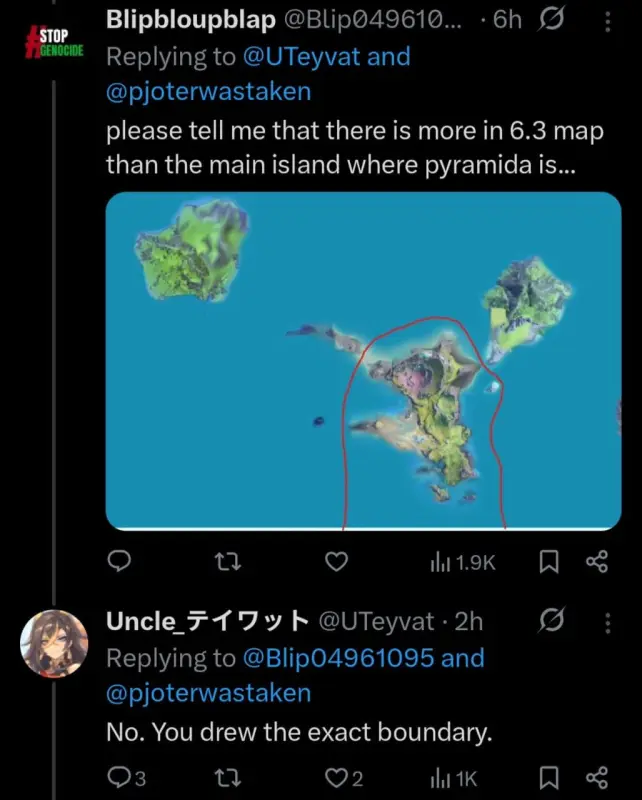 Ситуацию также прокомментировал один из известных инсайдеров, UTeyvat, ранее точно указавший, что в патче 6.3 появится новая локация. В X у него уточнили, будет ли на карте 6.3 что-то большее, чем основной остров с пирамидой. Диалог выглядел так: