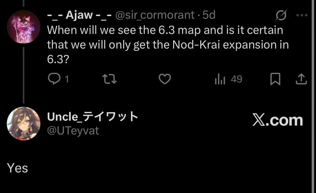 О карте 6.3: на вопрос о том, будет ли в обновлении 6.3 только расширение Нод-Края, UTeyvat ответил утвердительно.