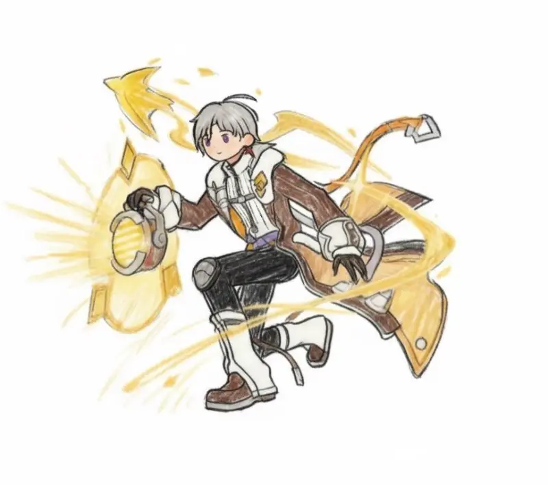 Юноша с короткими серыми волосами изображен в сильной, динамичной позе – словно в прыжке или стремительном рывке. Его куртка коричнево-белого цвета украшена будто меховыми или кожаными вставками, а вокруг персонажа парят золотые стрелы. В руках – фонарь Светоносцев. По слитым данным Иллуга – 4-звездочный Гео-копейщик, саппорт под Лунный кристалл.