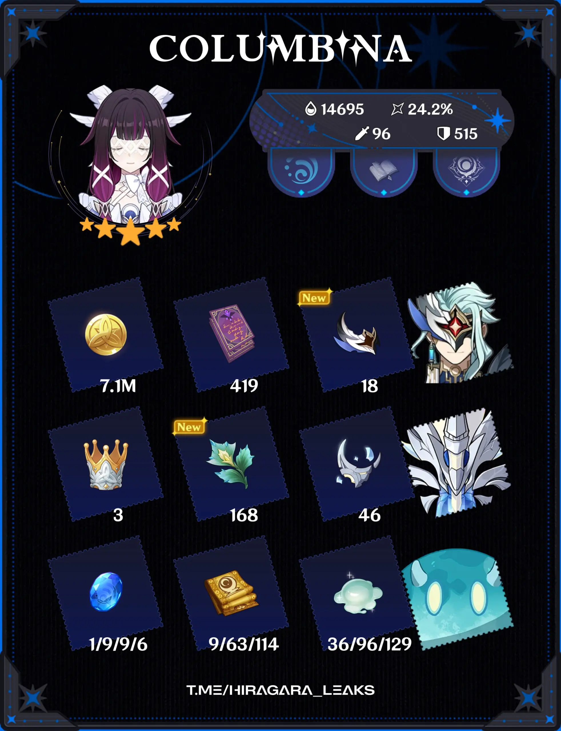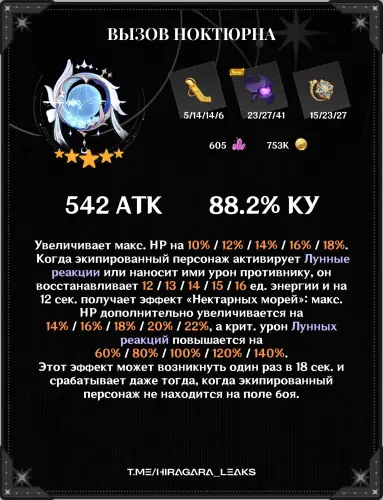 Следом на бете подтвердили и список материалов, необходимых для возвышения Коломбины и ее сигнатурного катализатора. Материалы выглядят вполне ожидаемо для персонажа из Нод-Края: региональные дропы, новый босс версии 6.3 и стандартные ресурсы.