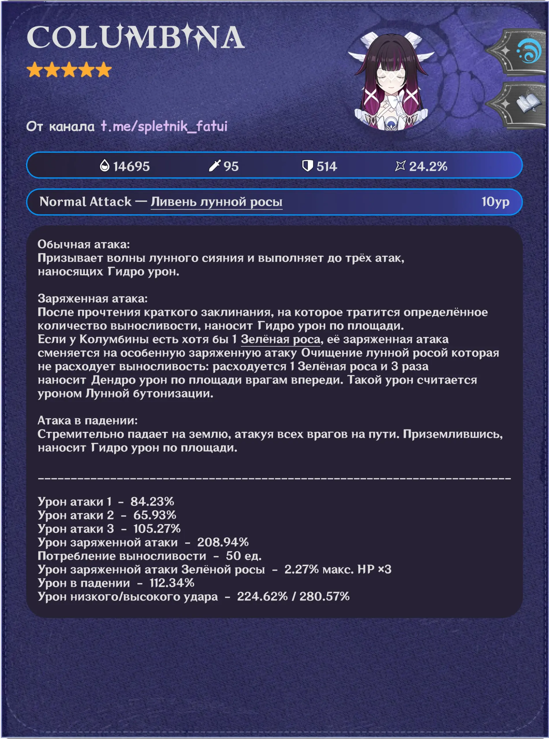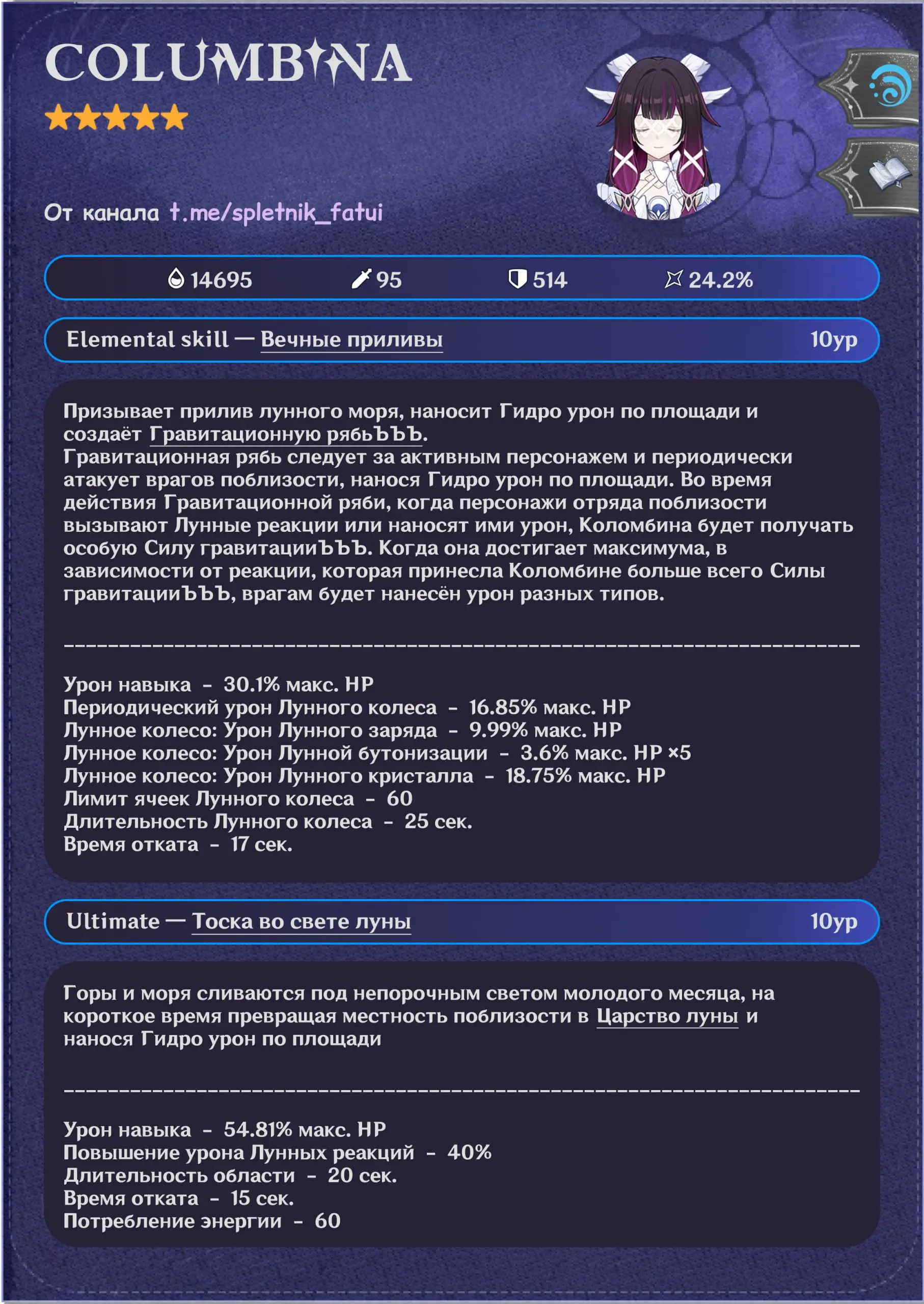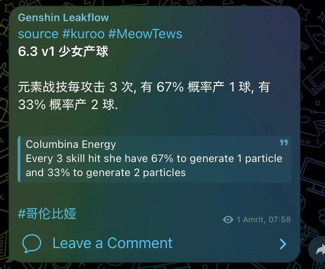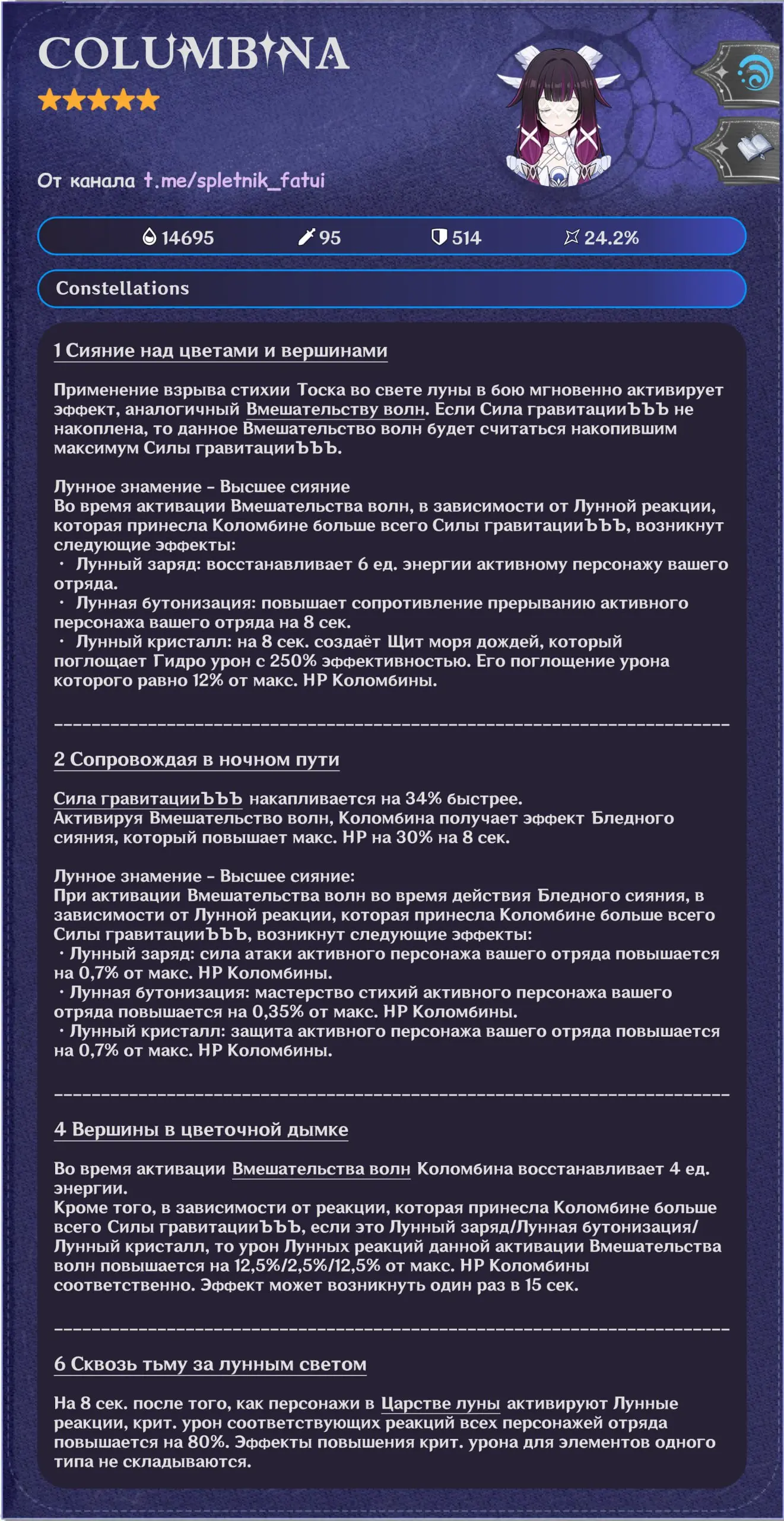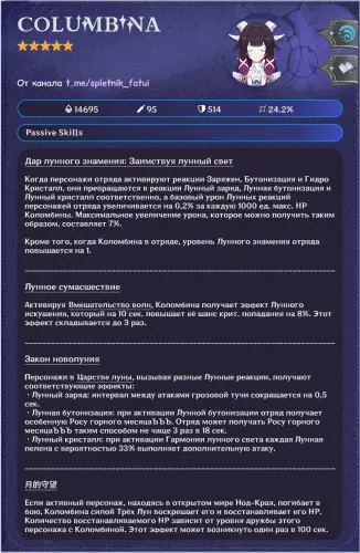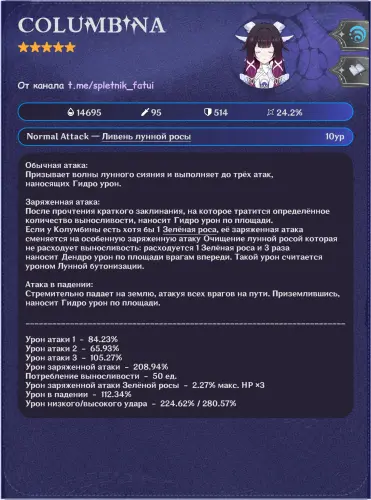 Первая волна утечек раскрыла полный набор навыков персонажа. По слитой информации, Коломбина работает как Гидро-катализатор, играющий вокруг лунных реакций.