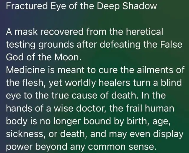 Fractured Eye of the Deep Shadow – материал отсылает к теме медицины, которая больше не обязана следовать естественным законам. В умелых руках, как говорится в описании, тело может выйти за пределы жизни и смерти.