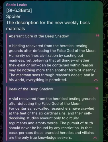 Beak of the Deep Shadow – текст описания критикует лженауку и говорит о стремлении к познанию без ограничений. Четкая отсылка к идеологии Дотторе – отказу от морали ради исследования.