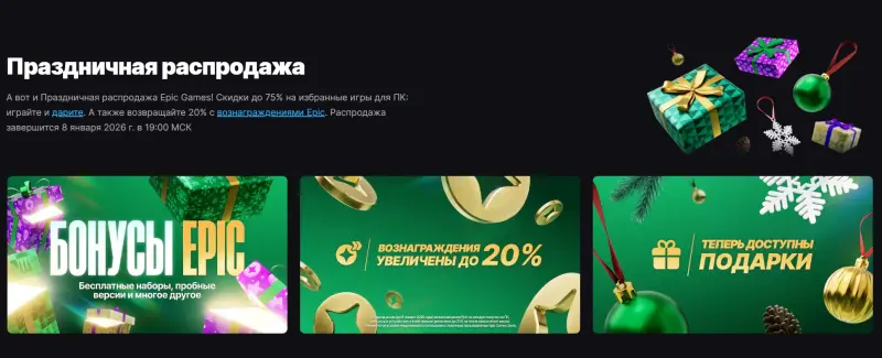 На площадке Epic Games Store недавно стартовала уже традиционная для нее новогодняя раздача игр. В 2025 году она началась почти в тоже время, что и в предыдущем. Начиная с 11-го декабря и заканчивая 8-м января 2026 года в 19:00 МСК, сервис будет дарить своим пользователям различные игровые проекты.