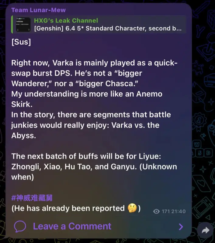 По словам инсайдера 神威难藏舅, текущее видение Варки сильно отличается от ожиданий части комьюнити. Его описывают не как улучшенную версию Странника или Часки, а скорее как быстрого свитч-DPS с акцентом на взрывной урон. По ощущениям от прототипа Варка ближе всего к концепции Анемо-Скирк.