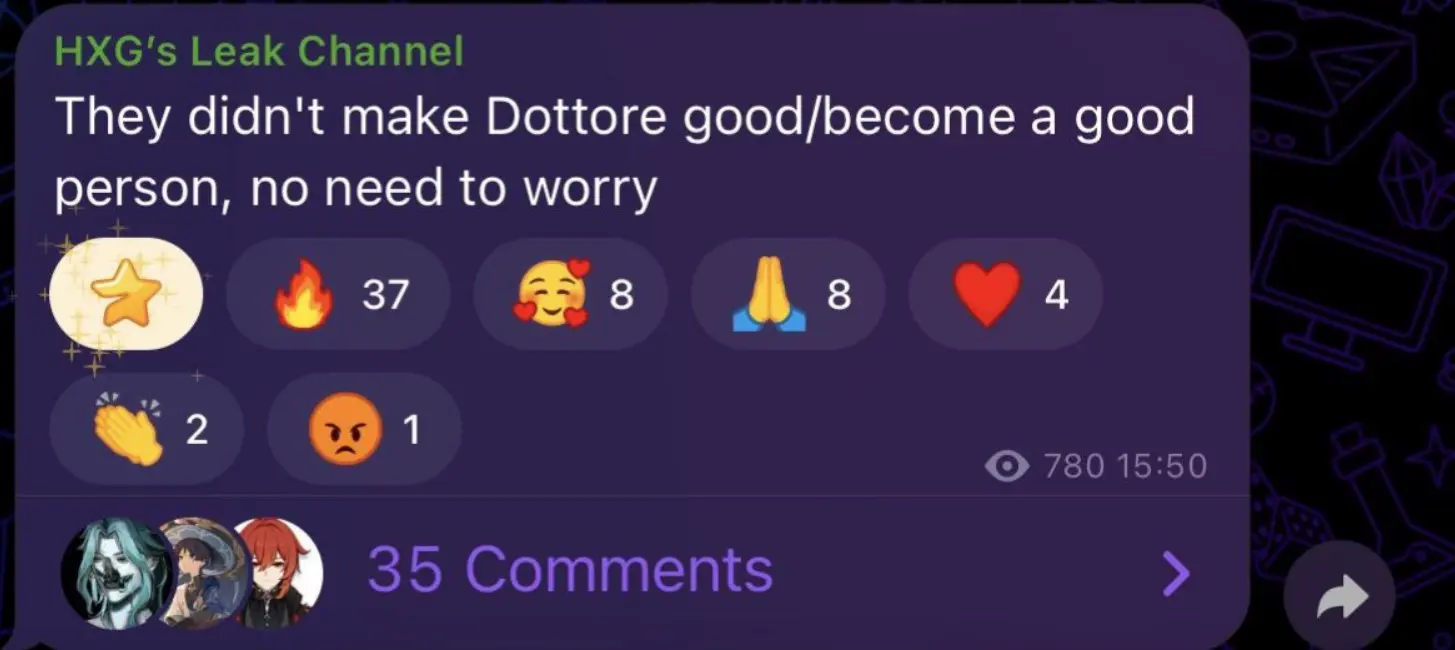 Согласно словам проверенного информатора HXG, разработчики не планируют превращать Дотторе в хорошего парня, как в случае со Странником, поэтому на этот счет можно не беспокоиться. Таким образом, до самого своего конца он останется злодеем. По этой причине очень маловероятно, что в будущем его сделают играбельным персонажем.