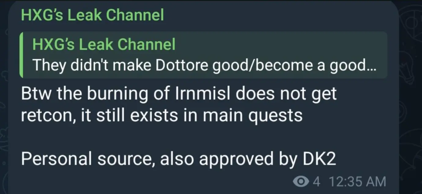 При этом, сославшись на DK2, инсайдер отметил, что команда не намерена проводить реткон (переосмысление) сожженного Ирминсуля. Речь идет об официальном арте, на котором показано пылающее дерево, а рядом стоит Дотторе. Это событие все еще предусмотрено в основном сюжете. Вряд ли это произойдет в патче 6.3, поэтому можно предположить, что хоть мы победим Дотторе, однако он выживет и появится в будущих заданиях Архонтов.