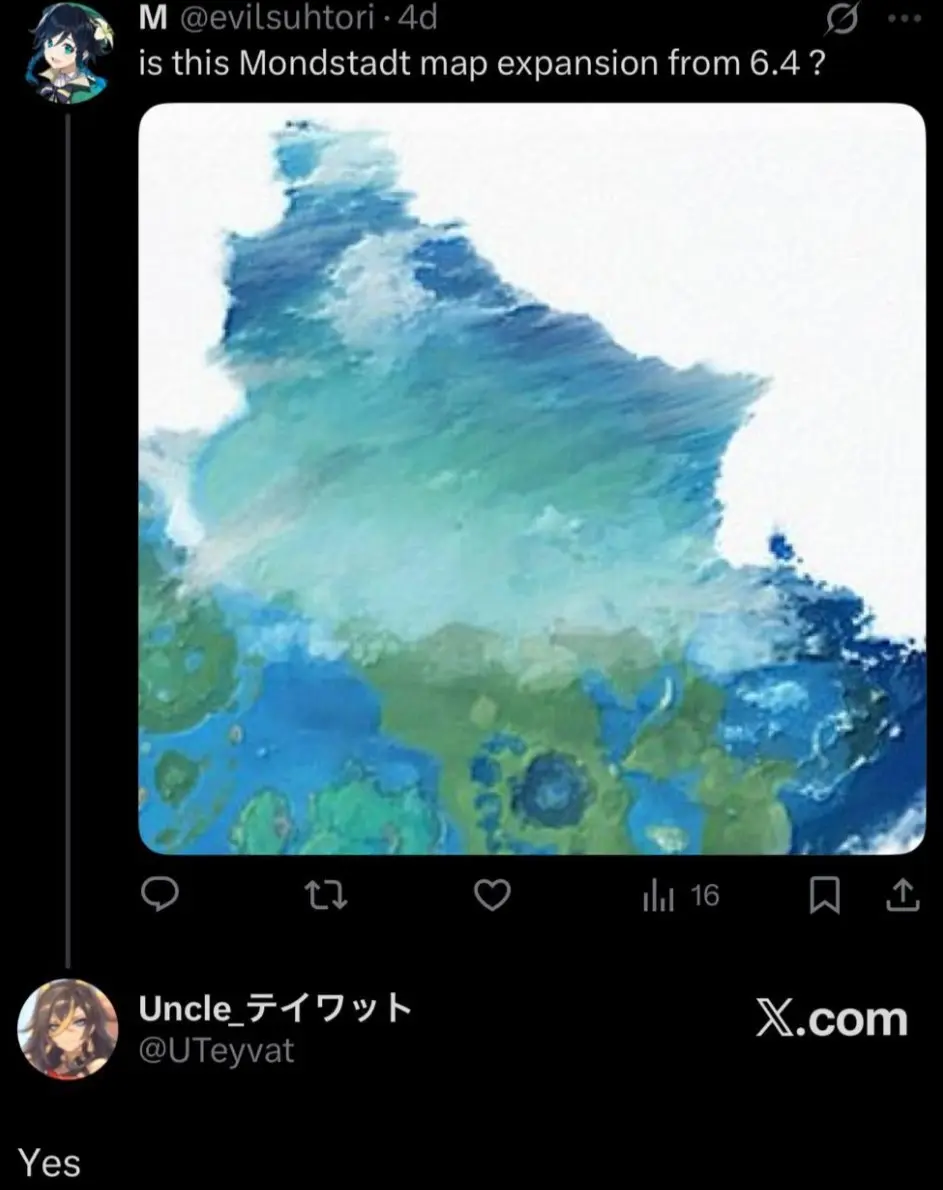 Один из пользователей спросил у инсайдера UTeyvat про расширение Мондштадта, которое должно произойти в обновлении 6.4, показав недавно утекшую в сеть полную карту Тейвата. Как оказалось, обширный кусок, появившийся на севере Анемо королевства, действительно является новой областью.