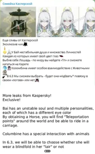 Инсайдером «Семейка Касперской» была слита довольно неожиданная информация касательно Цзы Бай и Коломбины из Genshin Impact. Напомним, что обе героини должны будут выйти в обновлении 6.3 (Луна IV).