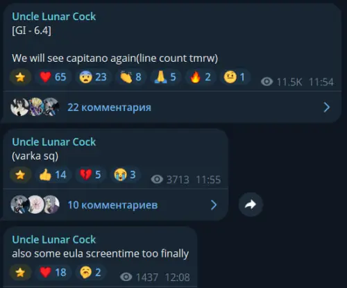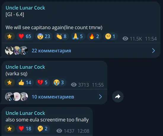 По данным от Uncle Lunar Cock, в задании, связанном с Варкой в версии 6.4, игроки снова увидят Капитано. Пока не уточняется, в каком формате состоится его появление, это может быть как флешбек из прошлого, так и неожиданный сюжетный поворот в настоящем. Кроме того, сообщается, что в этой же сюжетной линии появится Эола, что неудивительно, ведь в задании Варки, магистр ордена, скорее всего, вернется на родину в Мондштадт.