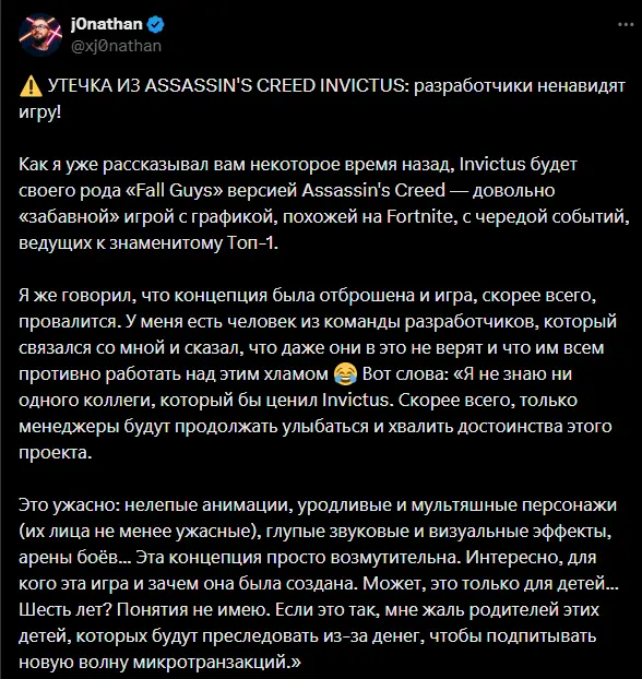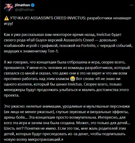 По сети разошелся очередной тревожный слух вокруг Assassin’s Creed Invictus – самостоятельного мультиплеерного проекта Ubisoft. По словам известного инсайдера и стримера j0nathan, внутри команды разработчиков отношение к игре далеко не радужное. Он утверждает, что получил информацию напрямую от одного из сотрудников Ubisoft, и если верить этим словам, энтузиазм по поводу Invictus внутри студии заметно угас.