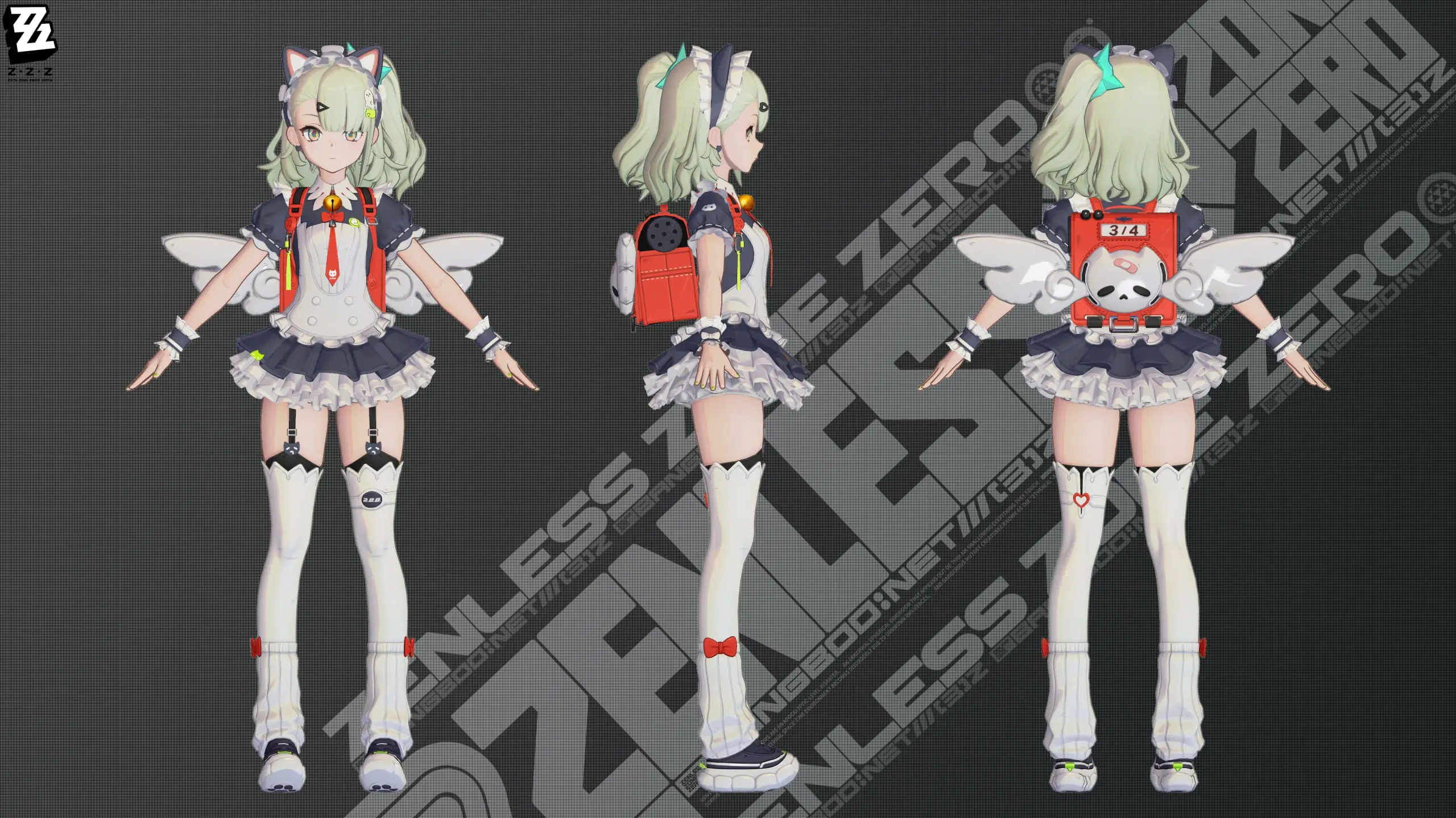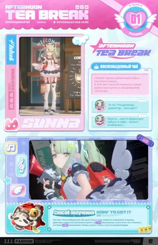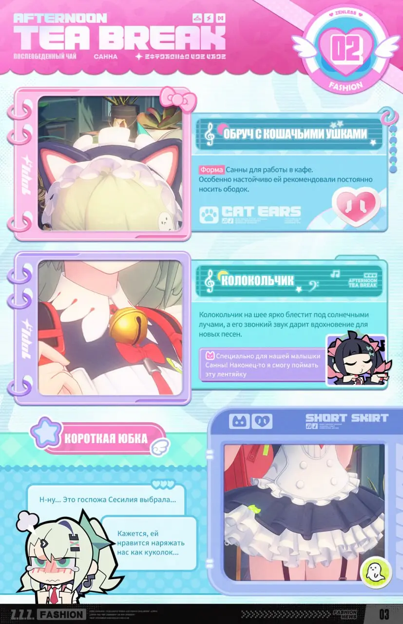 Официальный аккаунт Zenless Zone Zero позже опубликовал еще больше изображений скина. Образ получил название «Послеобеденный чай»: это наряд в стиле униформы горничной с большим колокольчиком на шее и кошачьими ушками на голове. Визуально костюм выглядит как прямой оммаж мейд-культуре Акихабары.