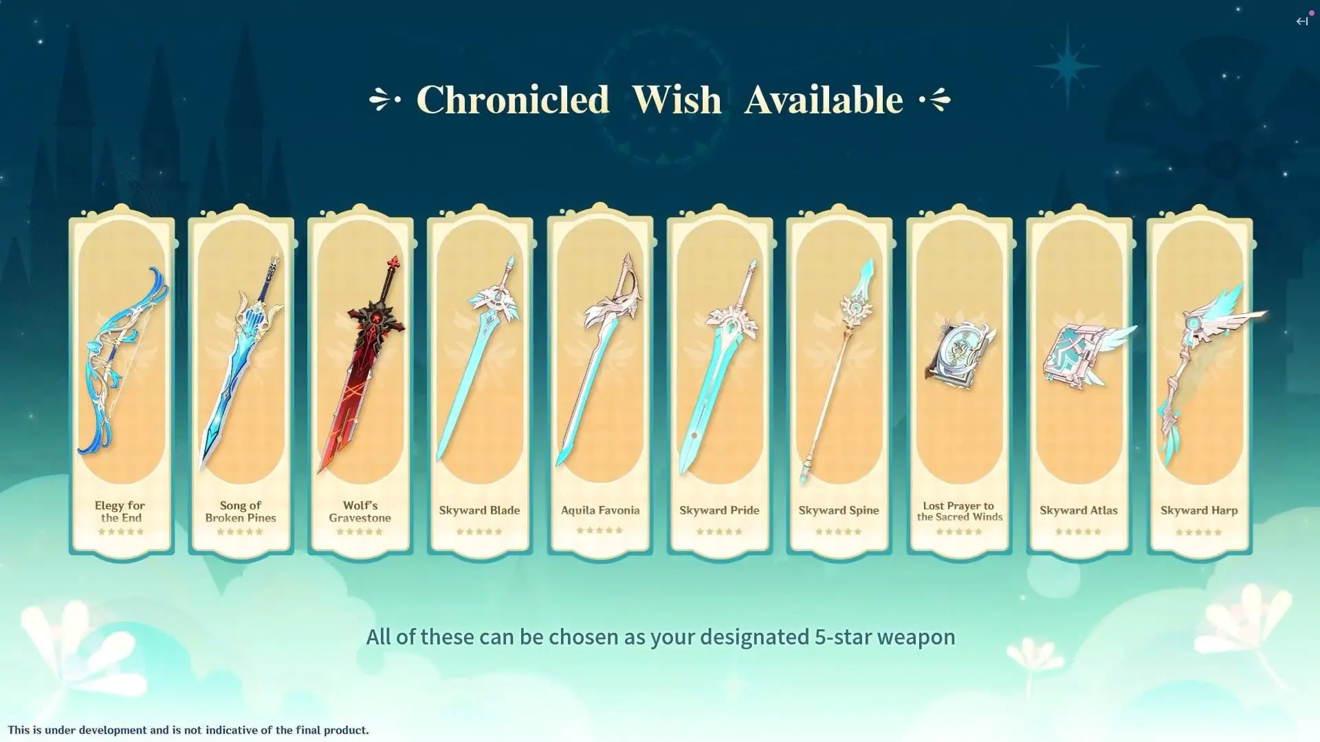Молитва хроник с 5★ оружиями и персонажами Мондштадта: Эола, Мона, Альбедо, Кли, Дилюк, Джинн.