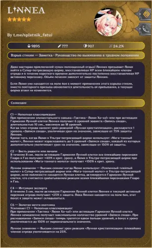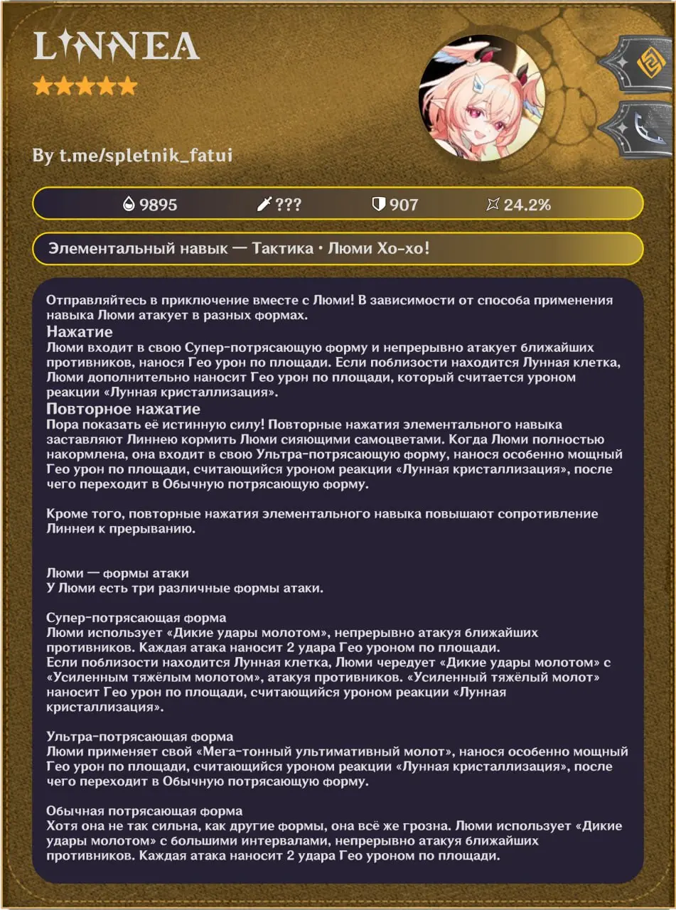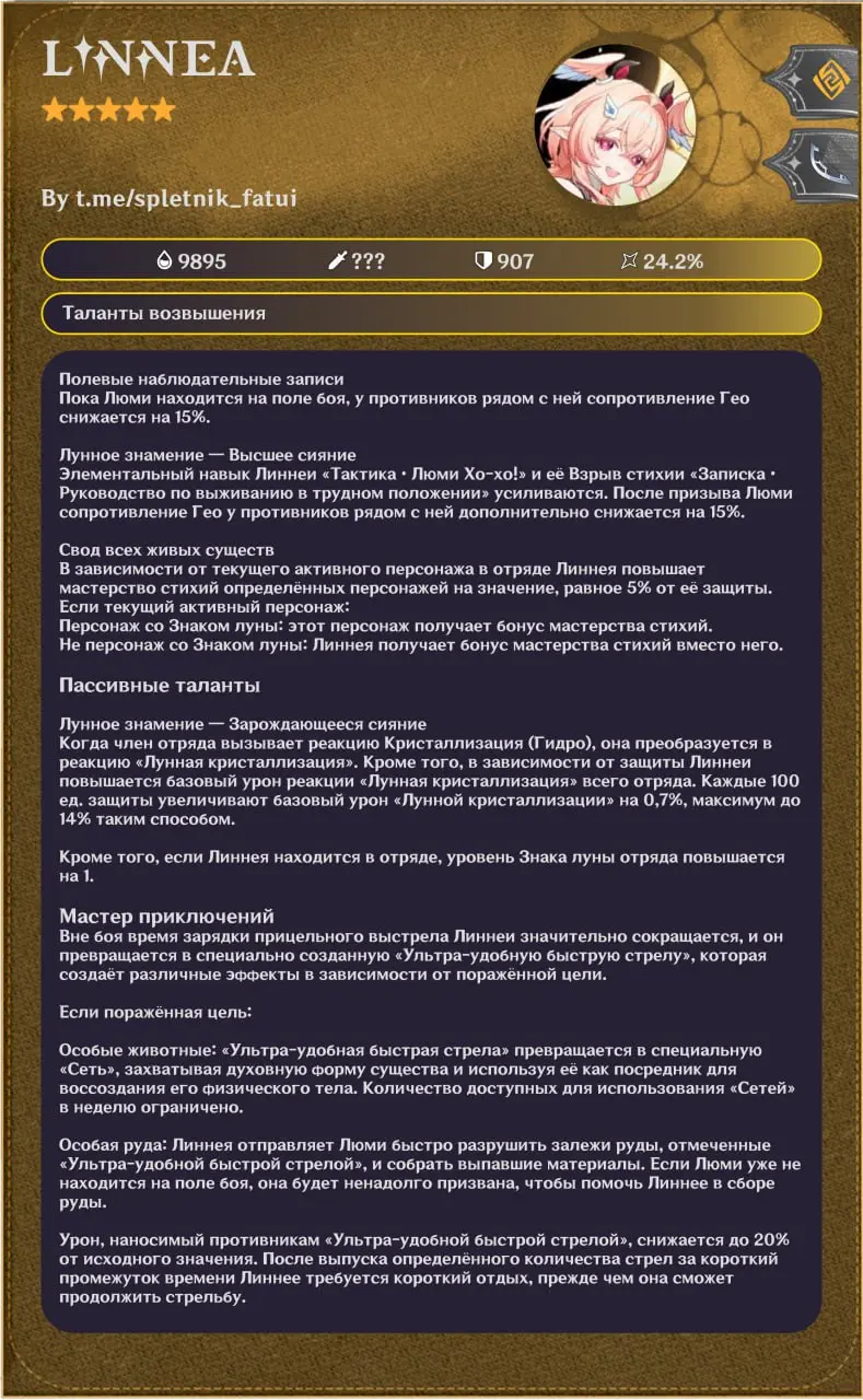 В сообществе Genshin Impact активно обсуждают новую волну утечек, посвященную Линнее – персонажу, который, по предварительным данным, может выйти уже в версии 6.5. Согласно ранней информации, Линнея является 5-звездочной Гео-лучницей, и последние сливы постепенно раскрывают все больше деталей о ее механиках и визуале.