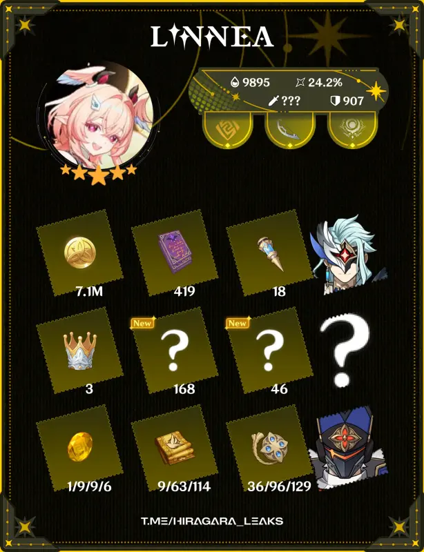 Второй слив от Seele и Hiragra раскрыл материалы возвышения самой Линнеи. На изображении можно увидеть список ресурсов для прокачки персонажа. При этом два материала остаются неизвестными. Это может указывать на новые предметы из версии 6.5 или на ресурсы из еще не представленной локации.