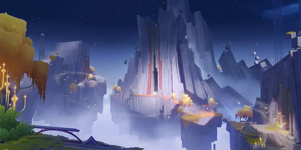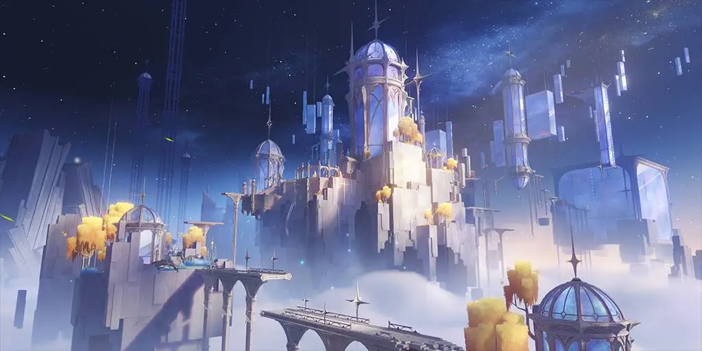 На первых кадрах Пространство Асмодей предстает как разрушенный город древности, вырезанный в гигантских вертикальных скалах или кристаллических структурах, парящих над облаками. По парящим платформам разбросаны золотистые деревья, контрастирующие с холодным сине-фиолетовым небом. Атмосфера кажется загадочной и элегической. А архитектура сочетает готику, барокко и футуристические элементы – купола с витражами, шпили со звездными символами, подвесные мосты и башни.