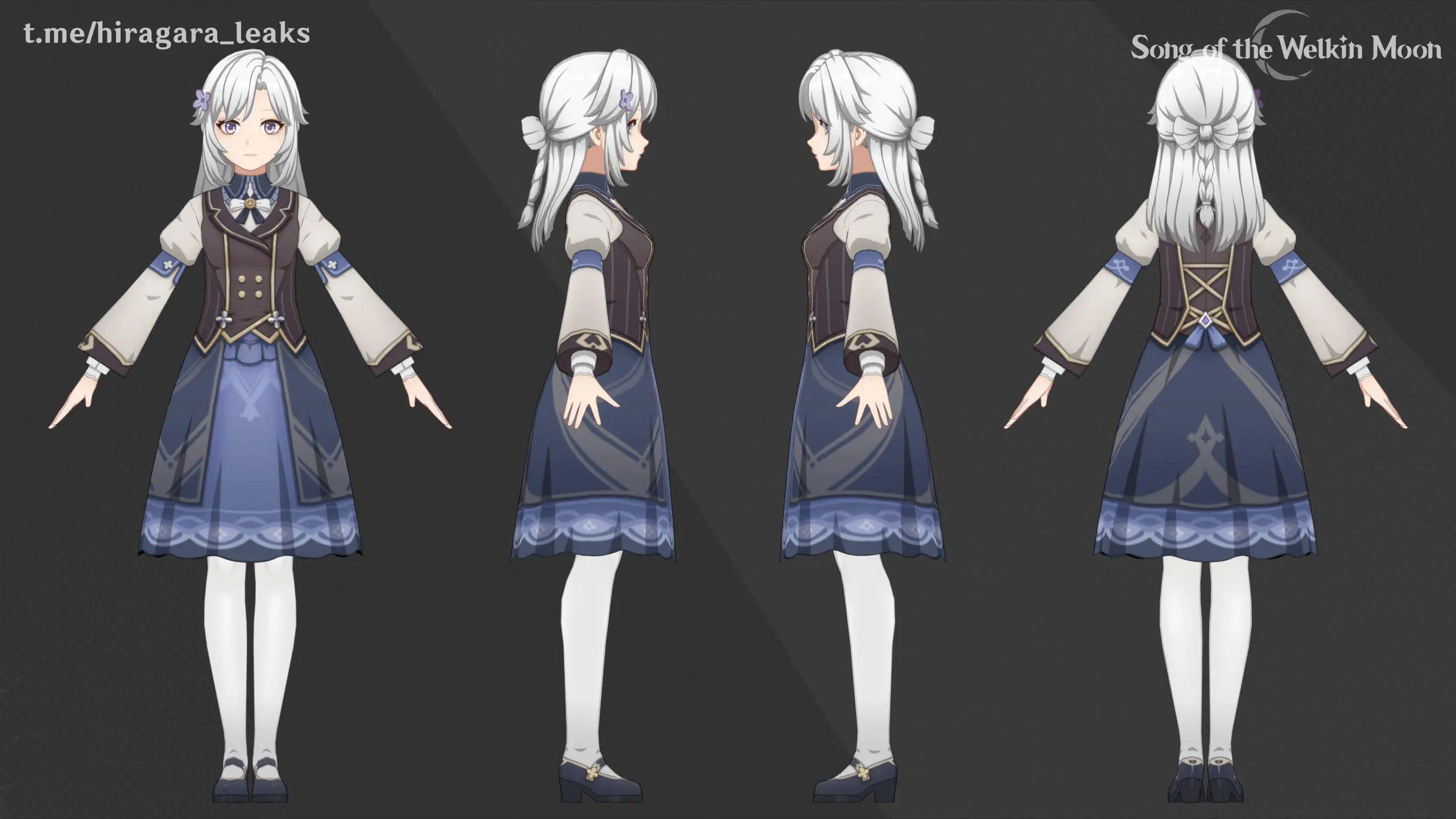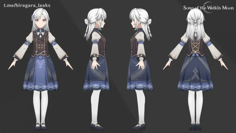 Hiragra опубликовал рендер нового персонажа. Это девушка с длинными белыми волосами, собранными в прическу и украшенную цветочными заколками. Она одета в элегантный наряд в стиле викторианской академии: темно-синее платье с кружевной отделкой, коричневый жилет с золотистыми пуговицами и белые колготки.