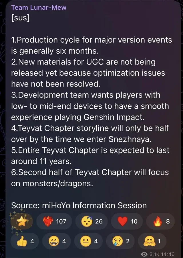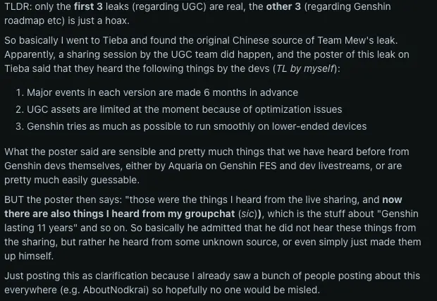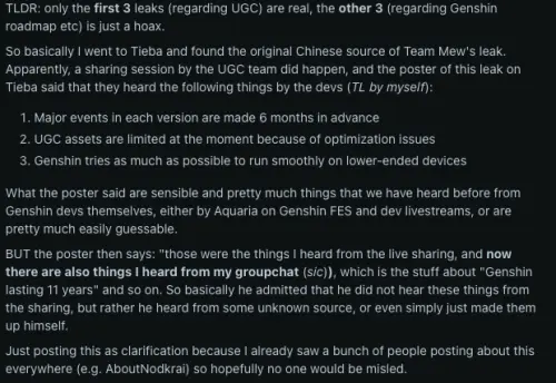Однако вскоре после публикации другой инсайдер на китайском форуме Teiba заявил, что достоверными являются только первые три пункта утечки, именно те, что касаются разработки событий и системы UGC. По его словам, остальная информация, включая слухи о долгосрочном плане развития игры и ее предполагаемой продолжительности в 11 лет, скорее всего является выдумкой.