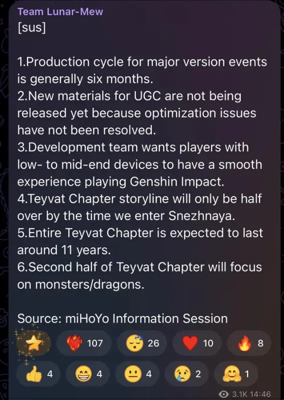 Изначально утечку опубликовала команда Team Mew, сославшись на материалы внутренней информационной сессии разработчиков HoYoverse. В этих данных говорилось о некоторых деталях разработки и планировании контента.