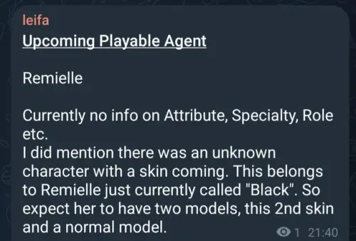Инсайдер leifa сообщила имя персонажа, которого игроки могли мельком заметить во время стрима разработчиков, посвященного версии 2.7. По ее словам, будущего играбельного агента будут звать Ремиэль.