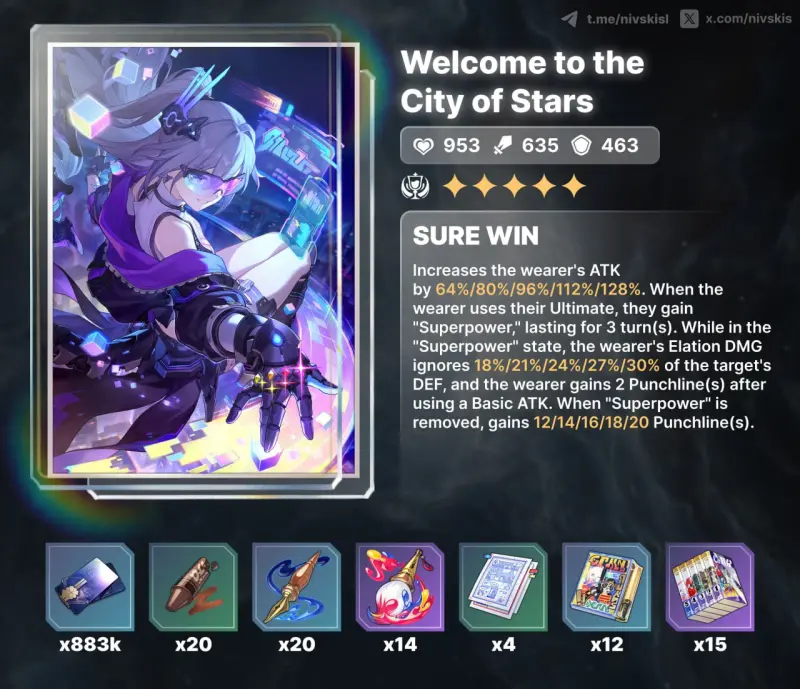 Также появился слив от nivskisl касательно сигнатурного светового конуса под названием Добро пожаловать в город звезд. Согласно описанию, он значительно усиливает атакующий потенциал персонажа. Конус увеличивает силу атаки владельца на 64% и после применения ультимейта дает эффект «Сверхсила» на три хода.