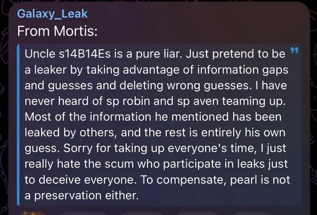 Бывший инсайдер под ником Mortis, ранее покинувший сообщество, неожиданно вернулся с резким заявлением. Через другого инсайдера, Galaxy, он опубликовал сообщение, в котором напрямую обвинил Uncle s14B14Es в систематическом обмане аудитории.