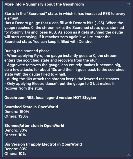Во время оглушения Геогриба реакции с другими элементами могут резко изменить ход боя. Применение Пиро мгновенно обнуляет шкалу, возвращает противника в состояние Выжженный и снимает с него оглушение. Электро, напротив, выводит его из оглушения без обнуления шкалы, а реакция Обострение полностью убирает индикатор и заставляет врага около десяти секунд активно атаковать, при этом он сохраняет пониженные сопротивления.