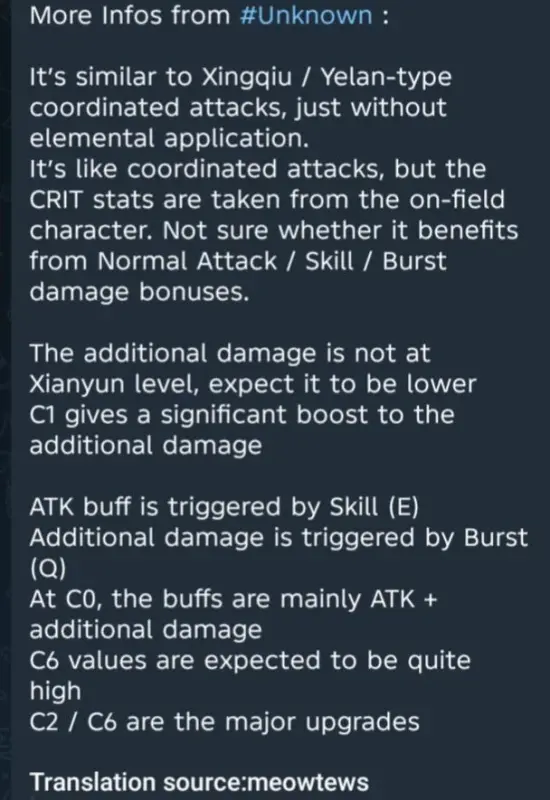 Фактически это будут дополнительные удары, которые срабатывают вместе с действиями активного персонажа. При этом их урон будет рассчитываться от крит. характеристик героя на поле, а не самой Николь. По предварительным данным, ее дополнительный урон уступает уровню Сянь Юнь, но все равно остается значимым источником ДПС.
