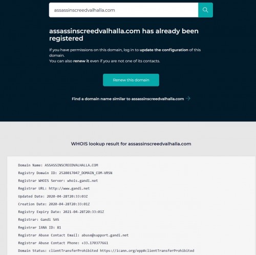 Недавно также пользователи обнаружили, что интернет-ресурс Gandi.net осуществил регистрацию домена Assassin’s Creed Valhalla. Именно он, как правило, регистрирует домены для игр, выпускаемых Ubisoft.