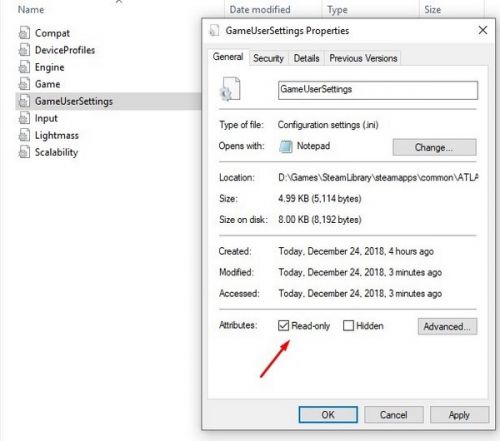 Выйдите из файла, щелкните правой кнопкой мыши на него, нажмите «Свойства» и установите для него значение «ТОЛЬКО ДЛЯ ЧТЕНИЯ». Потом нажмите «Применить» и ОК. Обязательно выполните это действия, так как при выходе обновления эти настройки могут сброситься, если вы позволите игре изменить их.